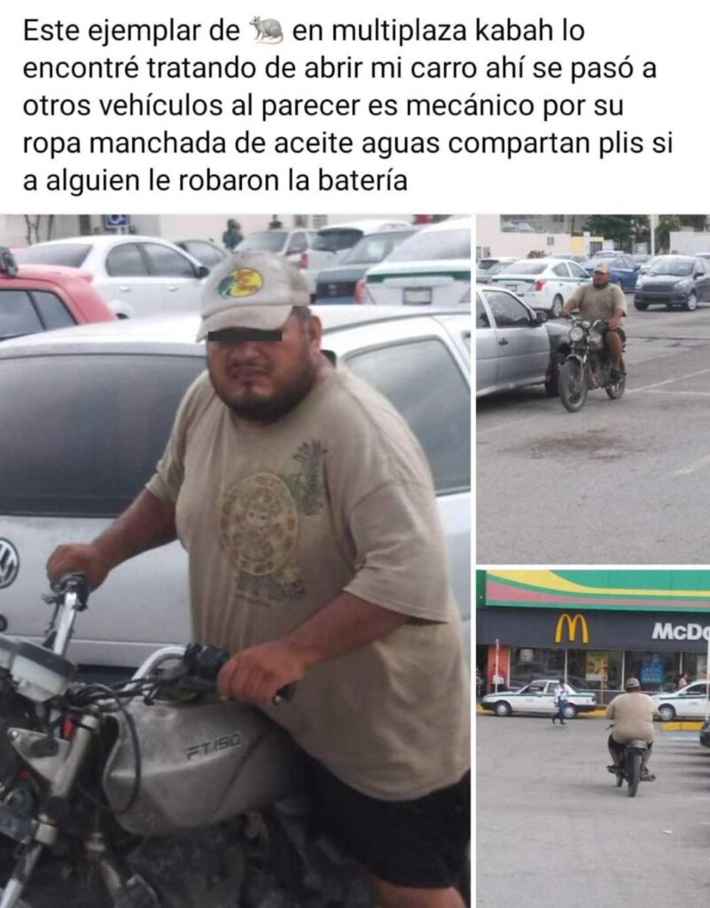 Cancún, Q. Roo (Marcrix Noticias).– Un sujeto fue denunciado y evidencia en las redes sociales por presuntamente robar partes vehiculares en los estacionamientos de esta ciudad de Cancún.