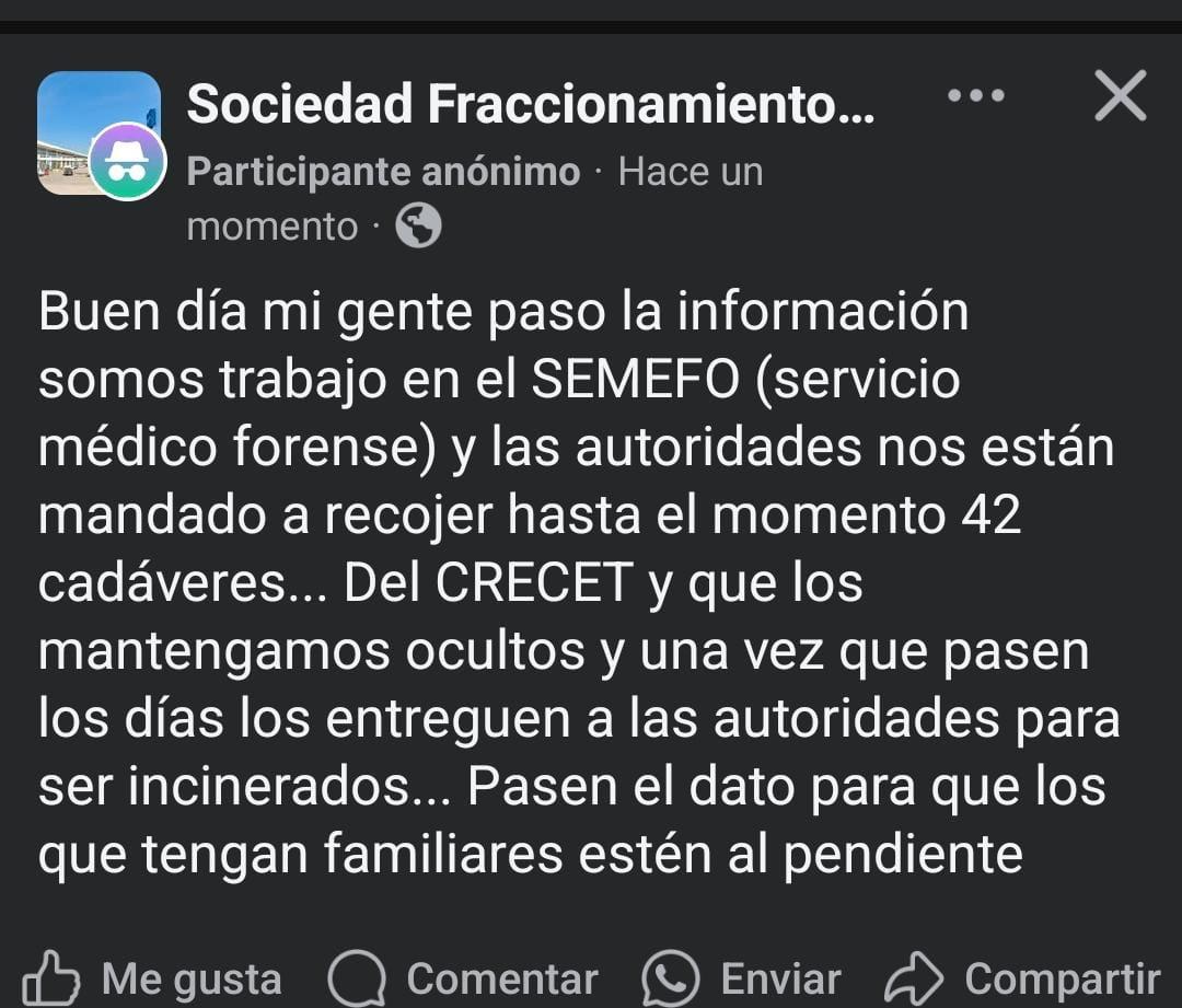 En tanto, al interior de las corporaciones policiales se difunde de manera extraoficial que los mandaron al penal a los del SEMEFO a levantar supuestamente 42 cadáveres de igual número de reclusos fallecidos en este motín.