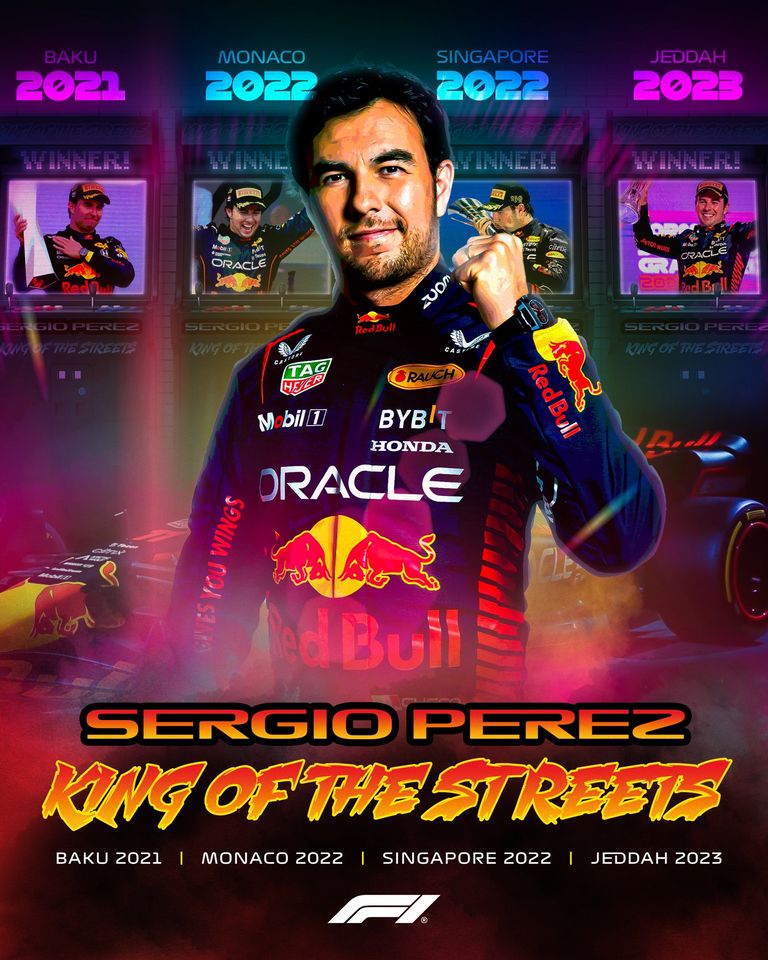 F1 destacó en redes sociales los triunfos del tapatío en Baku, en 2021; Mónaco y Singapur en 2022, y ahora en Jeddah, Arabia Saudita, todos circuitos también conocidos como urbanos.