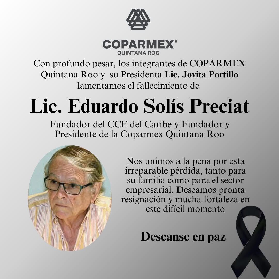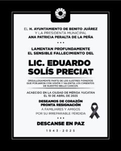 De igual forma, la presidenta municipal de Benito Juárez, Ana Patricia Peralta, expresó a través de sus redes sociales: “Lamentamos profundamente el fallecimiento del Lic. Eduardo Solís Preciat, pionero de Cancún y referente en el Consejo Coordinador Empresarial… Su legado vivirá siempre en la historia de Cancún”.