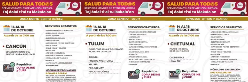 Cancún(Marcrix Noticias).- La Secretaría de Salud de Quintana Roo dio a conocer que, del 14 al 18 de octubre, se llevarán a cabo las Caravanas Médicas Móviles en los municipios de Cancún, Tulum y Chetumal.