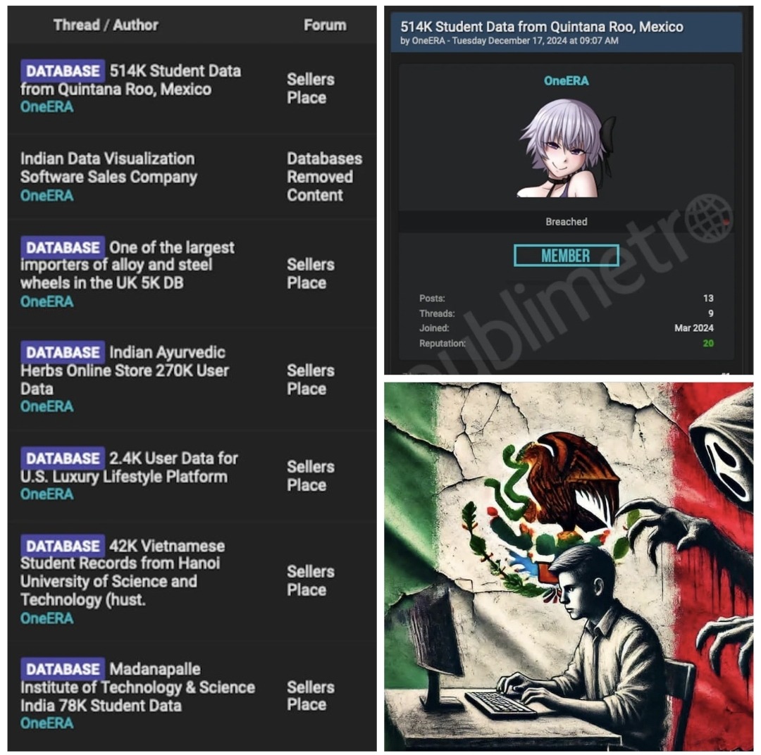 Cancún (Marcrix Noticias)-De acuerdo a la información e investigación de Publimetro una  base de datos con más de 514 mil registros de estudiantes de Quintana Roo ha sido puesta a la venta en la dark web por el vendedor conocido como OneERA, por 800 dólares. La información incluye datos personales sensibles como nombre completo, CURP, correos electrónicos, números telefónicos y contraseñas, lo que representa un grave riesgo de fraude electrónico y robo de identidad.