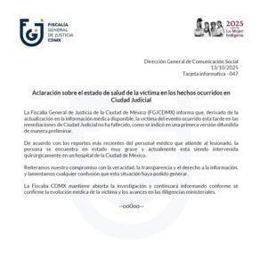 La FGJCDMX informó que continuará brindando actualizaciones sobre el estado de salud del abogado y los avances en la investigación del atentado.