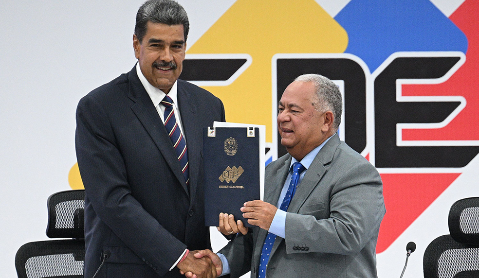 Venezuelan President Nicolas Maduro (L) shakes hands with the president of the National Electoral Council (CNE), Elvis Amoroso, during his proclamation at the CNE headquarters in Caracas on July 29, 2024, a day after the Venezuelan presidential election. President Nicolas Maduro was declared the winner of Venezuela's presidential election but the opposition and key regional neighbours immediately rejected the official results. (Photo by Federico PARRA / AFP)