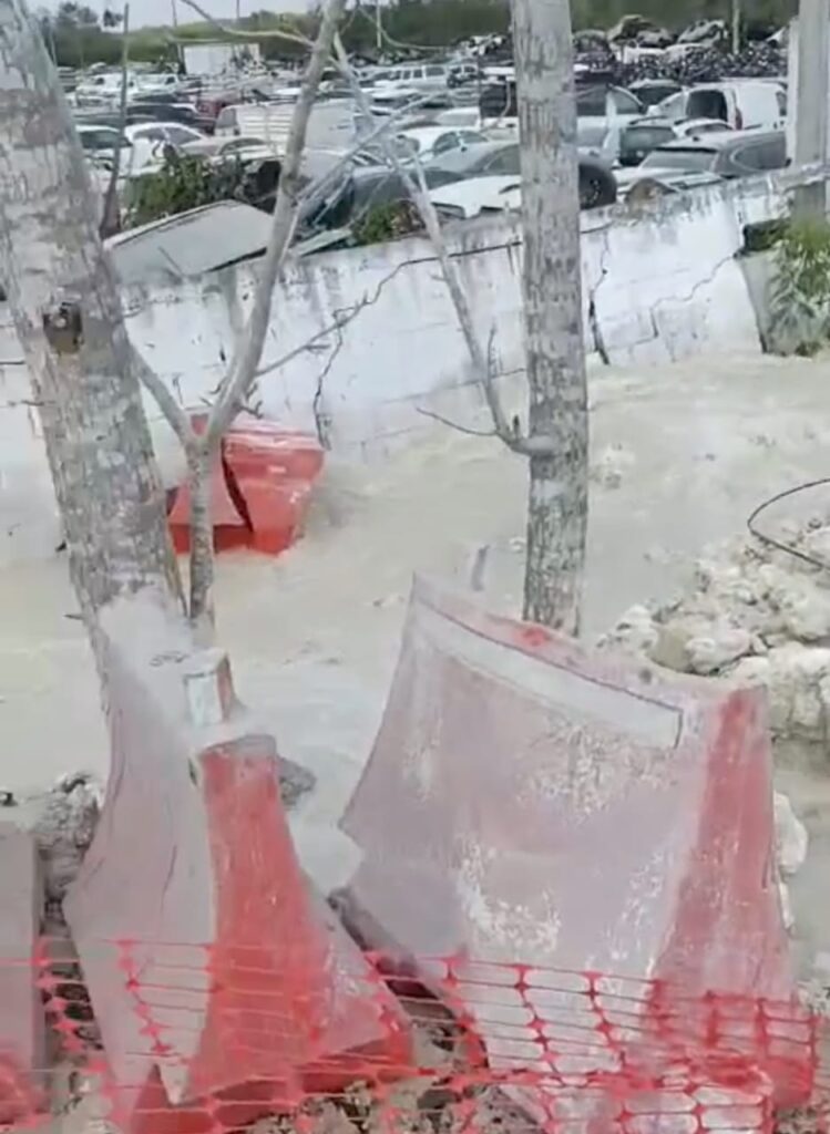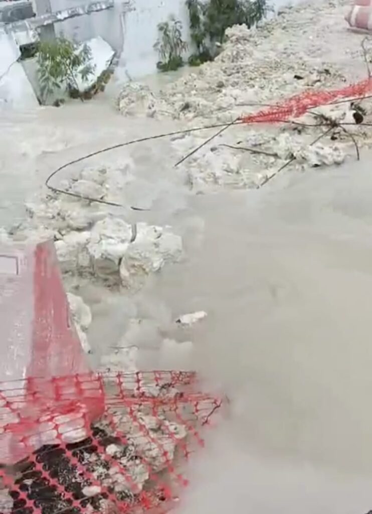 Exactamente la ruptura del tubo que abastece a Chetumal de agua potable ocurrió frente a las instalaciones del corralón de Grúas Chetumal, donde se realizan los trabajos del Tren Maya en especial un puente por donde atravesará la vía en construcción.
