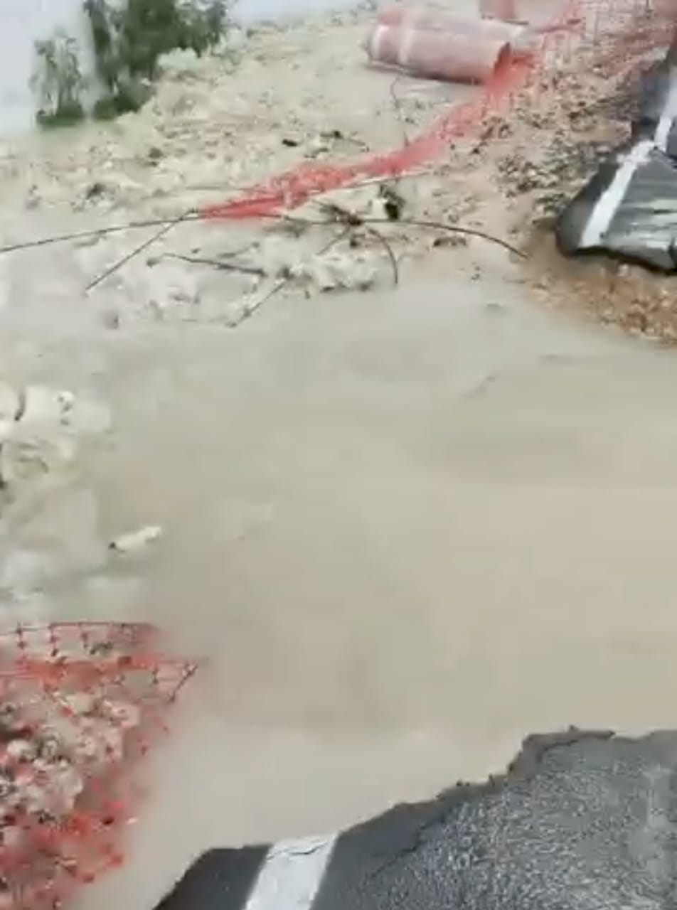 Exactamente la ruptura del tubo que abastece a Chetumal de agua potable ocurrió frente a las instalaciones del corralón de Grúas Chetumal, donde se realizan los trabajos del Tren Maya en especial un puente por donde atravesará la vía en construcción.