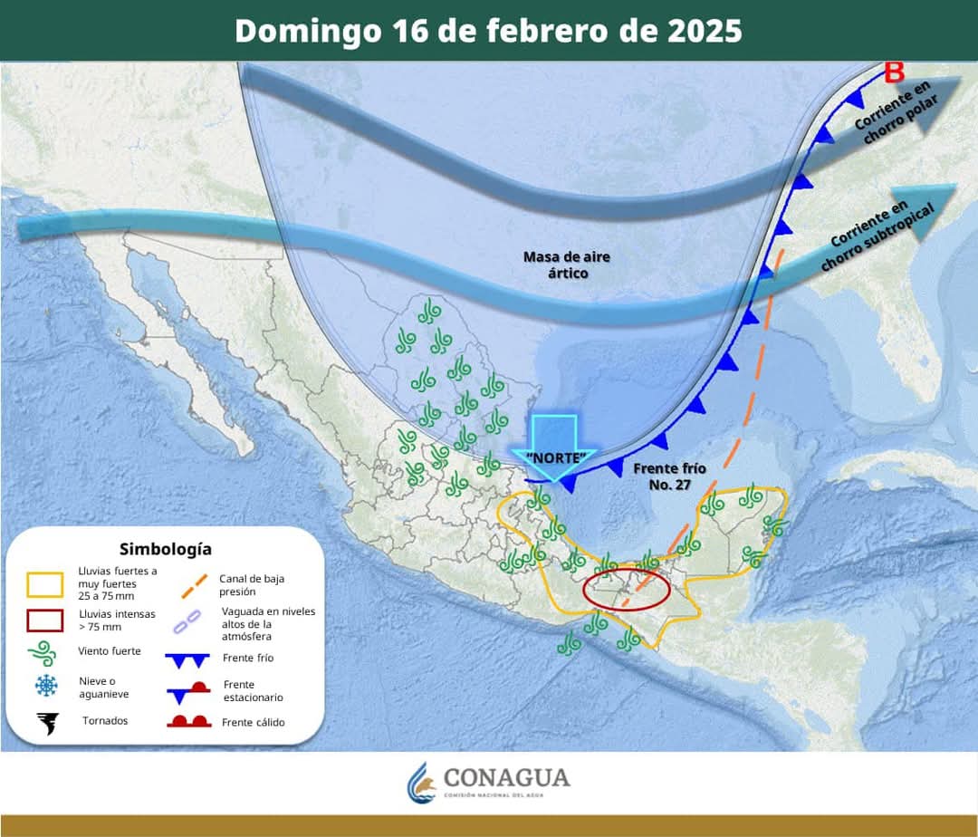 Cancún(Marcrix Noticias).- Debido al acercamiento del Frente Frío número Veintisiete a la porción Norte de la Península de Yucatán a partir de la tarde del día domingo 16 de febrero, se prevé: