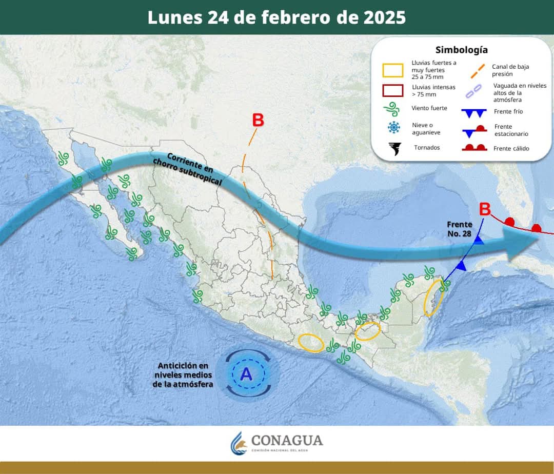 Cancún(Marcrix Noticias).- El reforzamiento por una nueva masa de aire frío del Frente Frío 28, se desplazará sobre la Península de Yucatán a partir y durante el día lunes 24 de febrero, originará en el estado de Quintana Roo fuertes lluvias, además de los siguientes efectos.