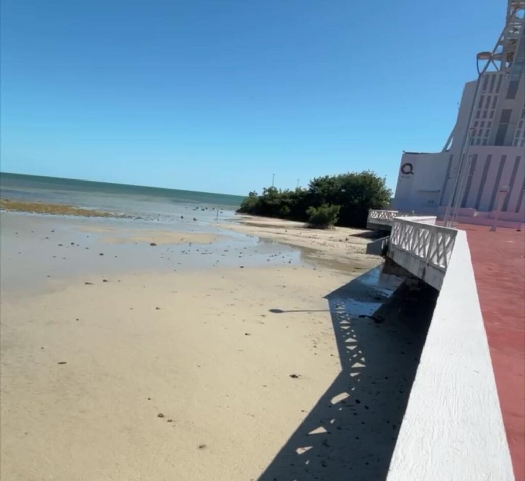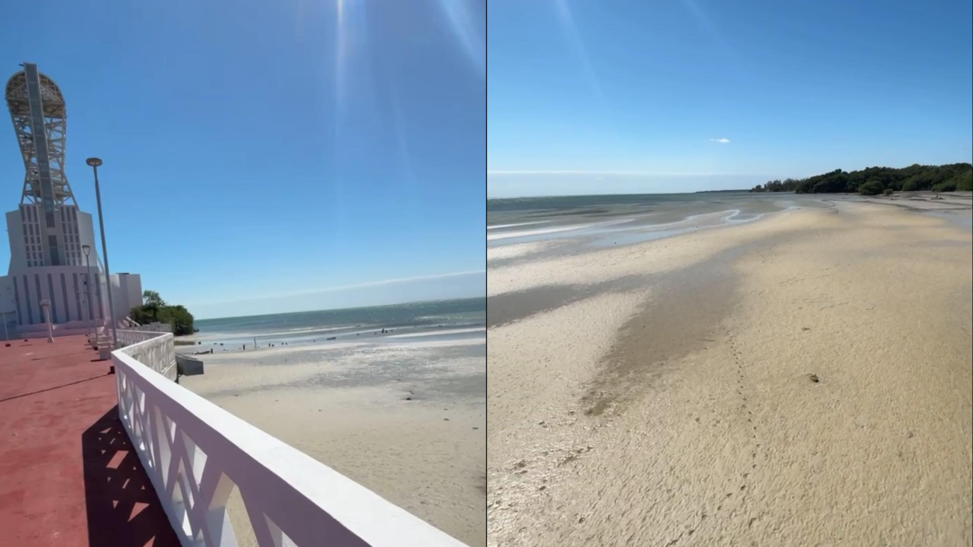 Imágenes captadas desde la zona de la Megaescultura muestran cómo el mar se alejó varios metros, dejando al descubierto amplias franjas de arena, un fenómeno que llamó la atención de quienes transitaban por la zona.