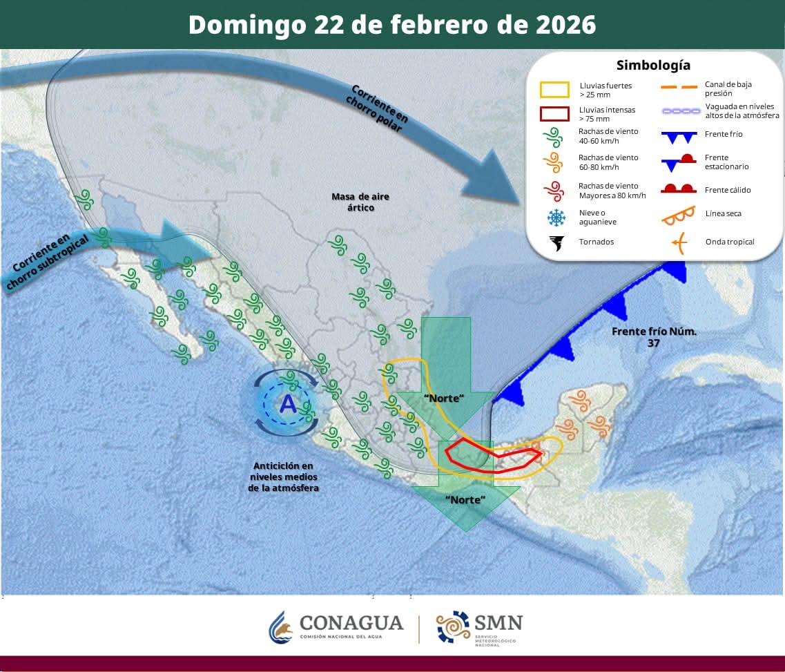 Cancún(Marcrix Noticias).- La Coordinación Estatal de Protección Civil de Quintana Roo informó a través de sus redes sociales sobre el acercamiento y desplazamiento del Frente Frío número 37 hacia la Península de Yucatán, fenómeno que impactará directamente a Quintana Roo a partir de la noche del domingo 22 y durante el lunes 23 de febrero de 2026.