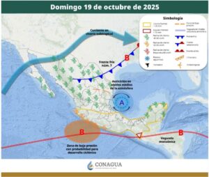 El fenómeno, combinado con canales de baja presión e inestabilidad atmosférica, generará lluvias intensas en Chiapas, particularmente en las regiones Sierra y Soconusco, muy fuertes en Oaxaca, Guerrero y Puebla, y precipitaciones fuertes en Veracruz, Quintana Roo, Ciudad de México, Morelos, Michoacán y el Estado de México.