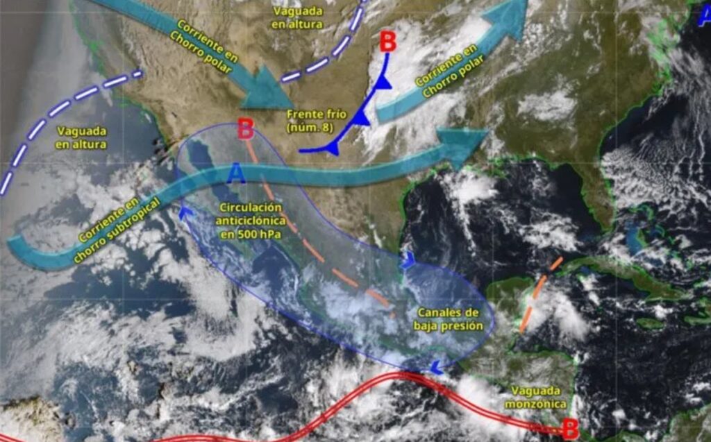 Además, se prevén vientos de 30 a 50 kilómetros por hora en zonas del norte, occidente y sureste, y oleaje de hasta tres metros en las costas de Oaxaca y Guerrero.