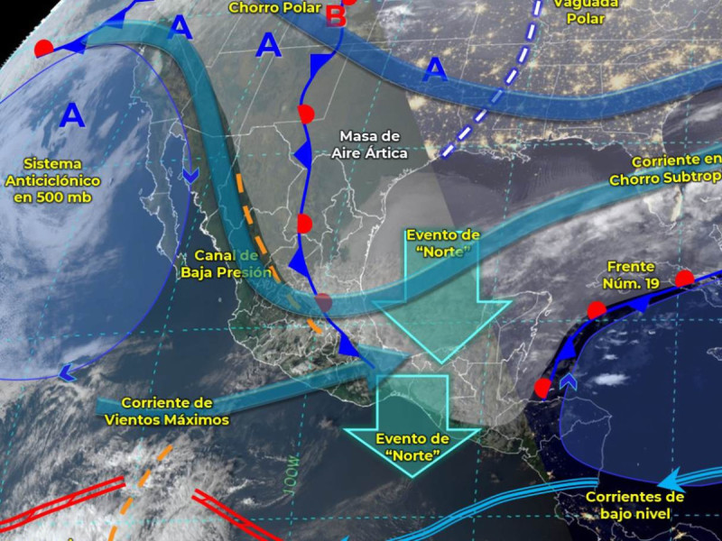 Continuará la onda gélida sobre entidades del noroeste, norte, noreste, centro, oriente y sureste de la República Mexicana, así como evento de “Norte” intenso en el litoral del Golfo de México, la Península de Yucatán e Istmo y Golfo de Tehuantepec.