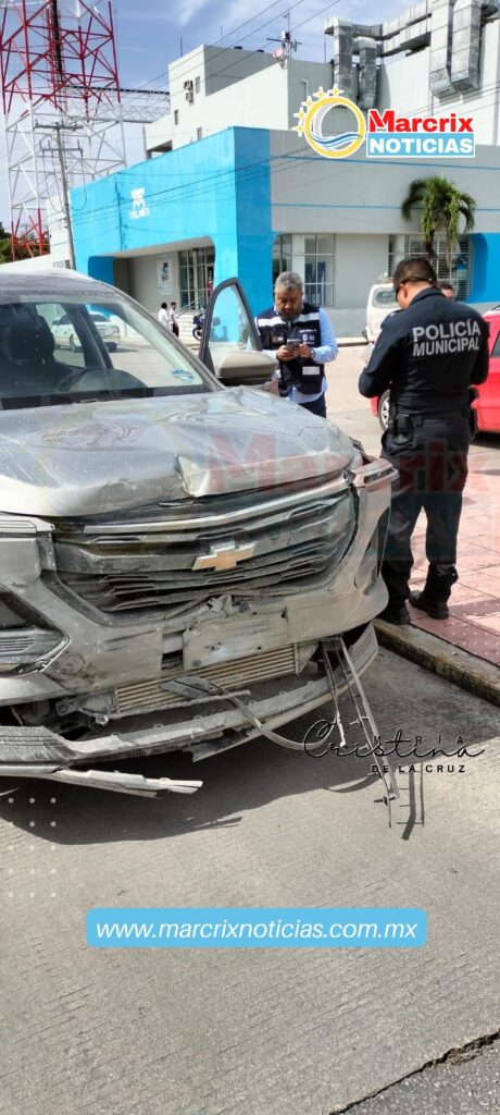 Cerca de las 13.40 horas en el cruzamiento de las Avenidas Benito Juárez y Lázaro Cárdenas, se suscitó un accidente de tránsito, entre una camioneta Captiva Chevrolet color gris con placas del Estado de Yucatán, una Mini Van color blanco de la Nissan y un golf gris Volkswagen, ambos con placas de Quintana Roo, que aproximadamente deja un saldo de más de 75 mil pesos en daños materiales que incluye el poste de alumbrado público derribado a consecuencia de la fuerte colisión.