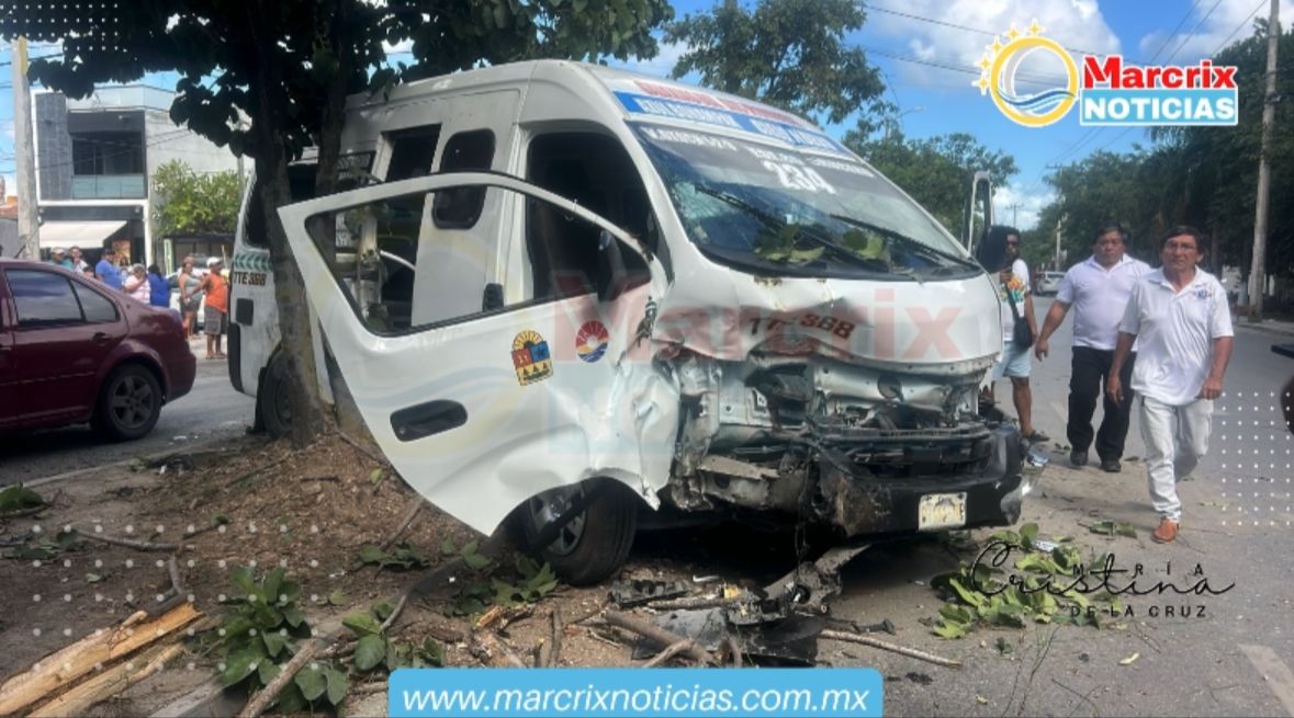De acuerdo con los primeros reportes, el impacto ocurrió a las 13:45 horas, cuando la camioneta se incorporó a la vialidad desde una calle lateral, presuntamente la calle Manzano, momento en el que fue alcanzada por la combi que circulaba con dirección hacia la avenida Kabah. Tras la colisión, la unidad de transporte público terminó sobre el camellón central, derribando un árbol y quedando con severos daños en la parte frontal.