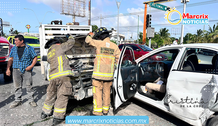 Cancún (Marcrix Noticias).- Un fuerte choque se registró la tarde de hoy jueves entre un vehículo Chevrolet Aveo blanco y una camioneta Estaquita Blanca.