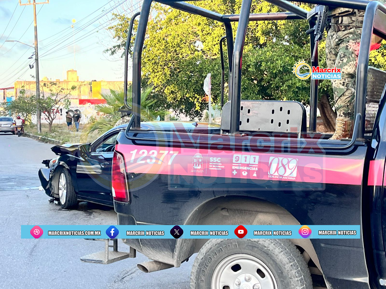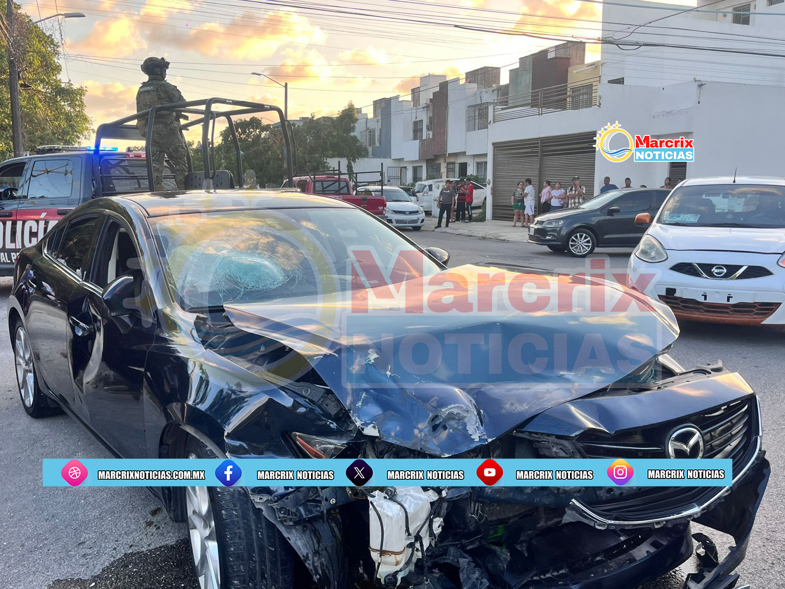 Cancún (Marcix Noticias).- Un fuerte accidente se registró la tarde de este viernes entre un vehículo Mazda y una Jeep Liberty en el cruce de las avenidas Felipe Carrillo Puerto y Cecilio Chi, en el fraccionamiento Paseos Kabah de Cancún.