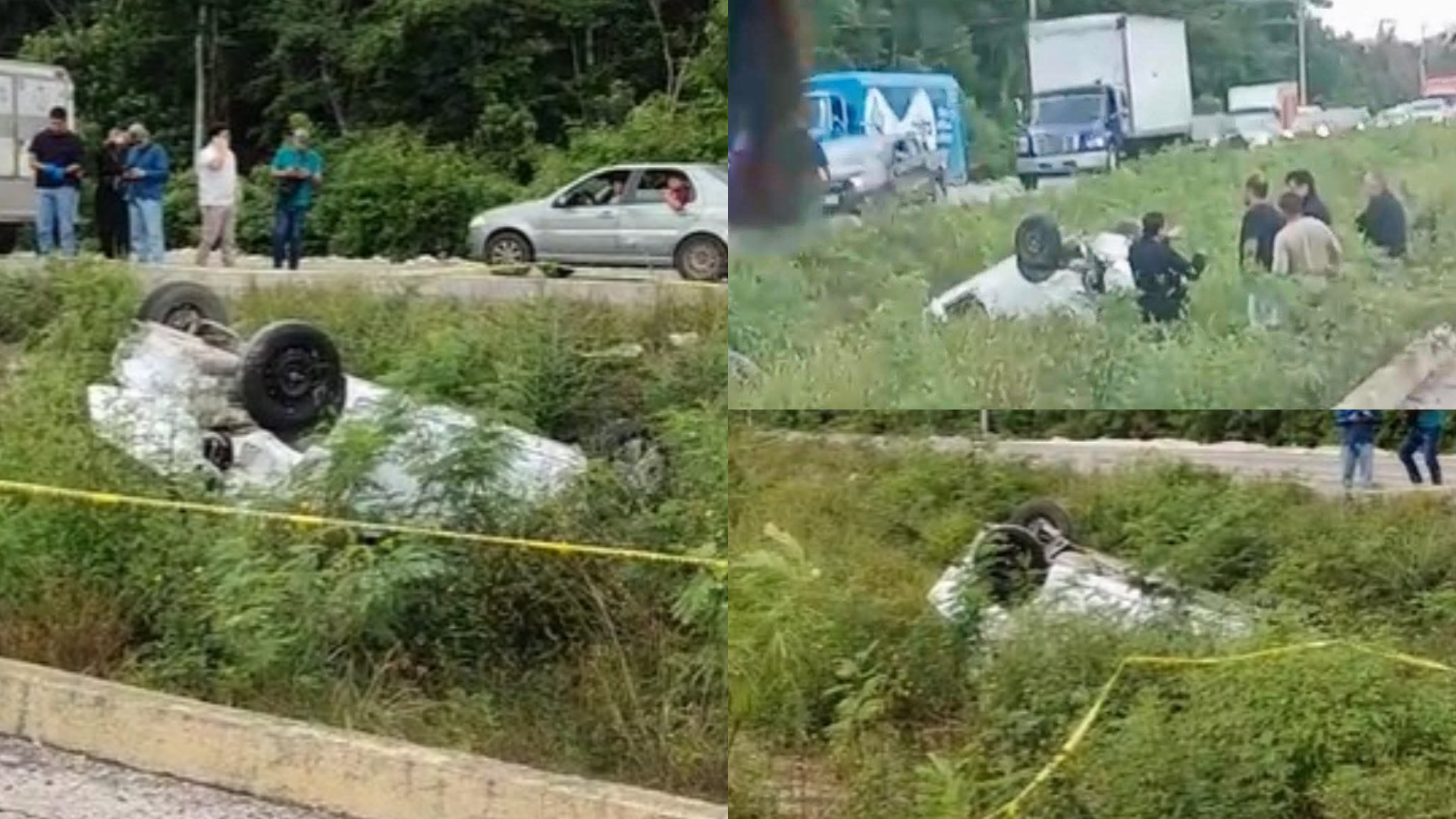 El vehículo terminó volcado en el área verde del camellón central, a la altura de la entrada a Puerto Morelos, lo que provocó carga vehicular en ese tramo de la carretera.