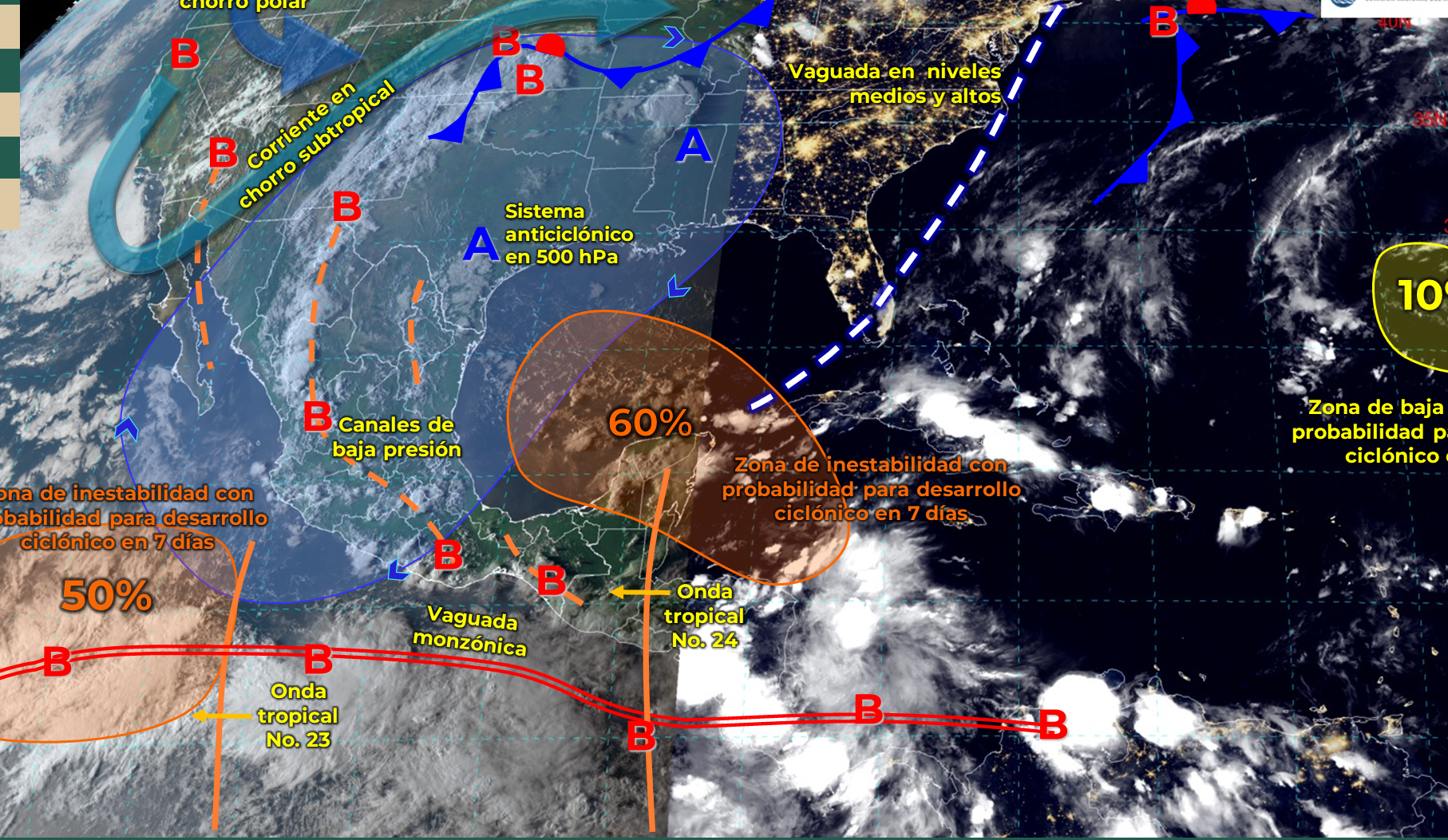 Para mañana, la onda tropical No. 24 se desplazará sobre el sureste mexicano, interaccionará con una vaguada en niveles altos de la atmósfera y en superficie con la vaguada monzónica, dichos sistemas propiciarán lluvias fuertes a puntuales muy fuertes en la región mencionada; con lluvias puntuales intensas en Oaxaca, Chiapas, Tabasco, Campeche, Yucatán y Quintana Roo.
