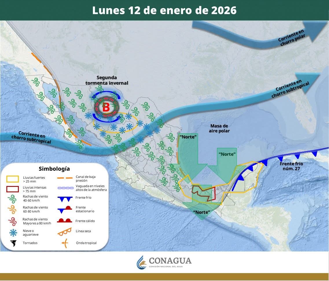 El SMN también advirtió sobre un evento de “Norte”, con vientos sostenidos de entre 20 y 30 kilómetros por hora y rachas que podrían alcanzar los 60 kilómetros por hora en Quintana Roo, Campeche y Yucatán, lo que incrementa el riesgo por caída de ramas, anuncios y estructuras ligeras.
