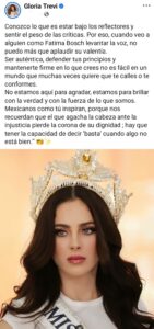 “Conozco lo que es estar bajo los reflectores y sentir el peso de las críticas. Por eso, cuando veo a alguien como Fátima Bosch levantar la voz, no puedo más que aplaudir su valentía”, escribió la cantante.