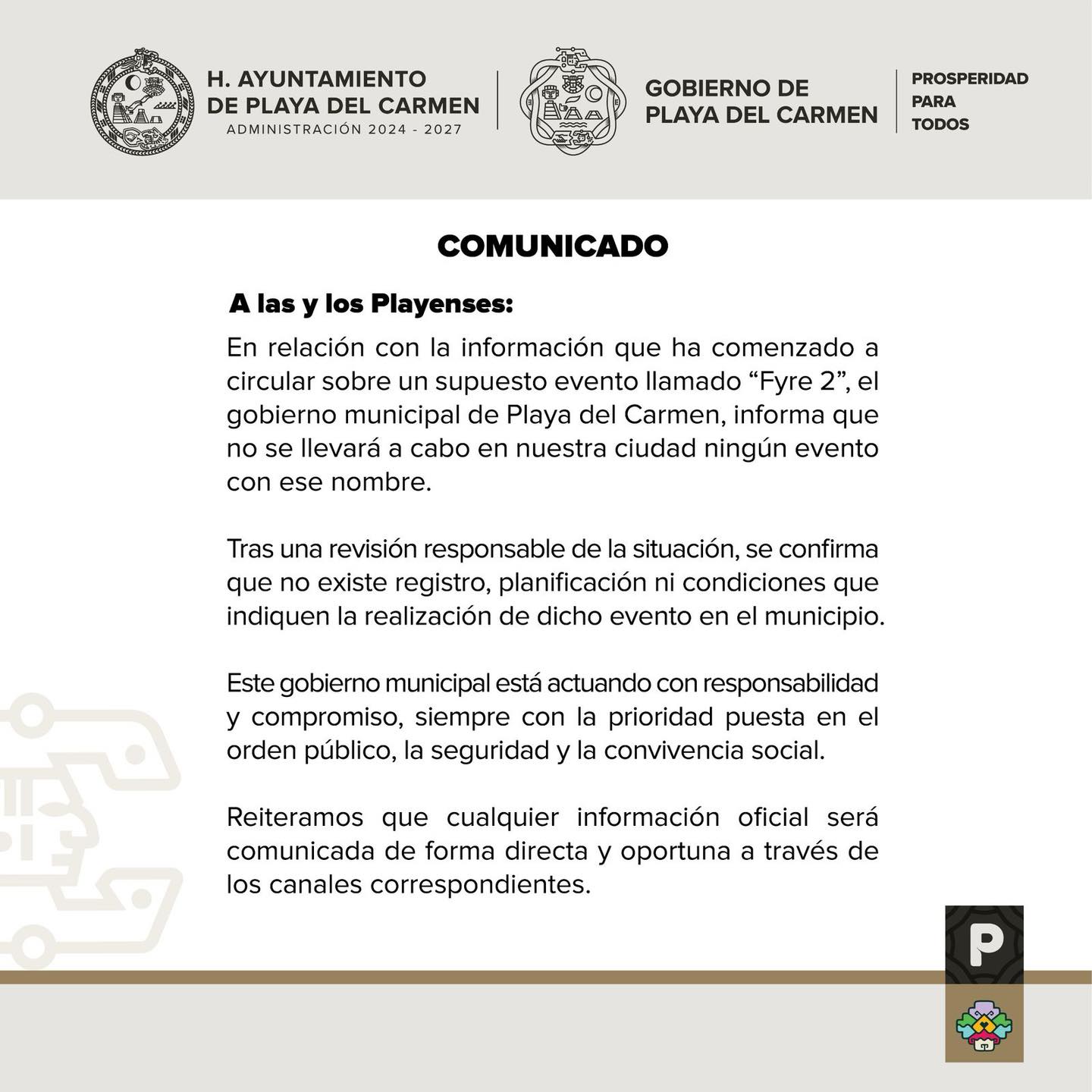 El Ayuntamiento de Playa del Carmen aclaró que el supuesto evento llamado “Fyre 2” no se llevará a cabo en el municipio. No hay registro ni planificación de dicho festival, y cualquier información oficial será comunicada por los canales oficiales.