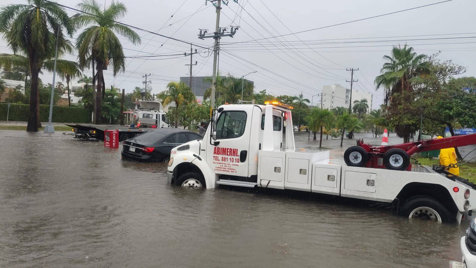 Las fuertes lluvias en Cancún dejaron vehículos varados y cierres viales en avenidas principales de la ciudad.