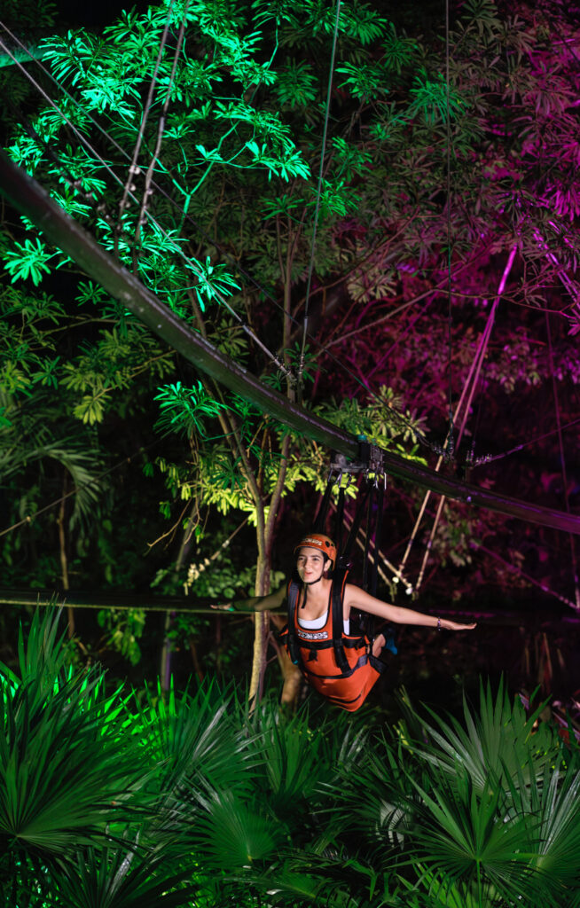 Adentrándose en un reino donde la realidad se desvanece en un espectáculo de luces y sombras, los visitantes pueden disfrutar de un emocionante tobogán que culmina en un refrescante pozo natural. También tienen la opción de sumergirse en la selva bajo la noche estrellada en el Vuelo de Búho, rodeados de luciérnagas y destellos, experimentando la sensación de volar.