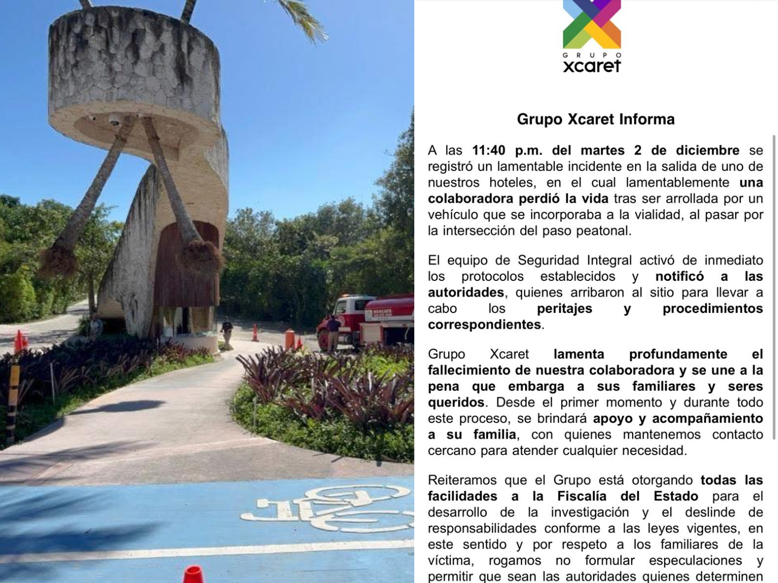 Playa del Carmen (Marcrix Noticias).– Después del accidente en el que una trabajadora perdió la vida, tras ser atropellada por un camión de personal en el acceso del hotel Xcaret Arte, el Grupo Xcaret emitió un posicionamiento en el que lamentó el hecho y aseguró que brinda acompañamiento a los familiares de la víctima.