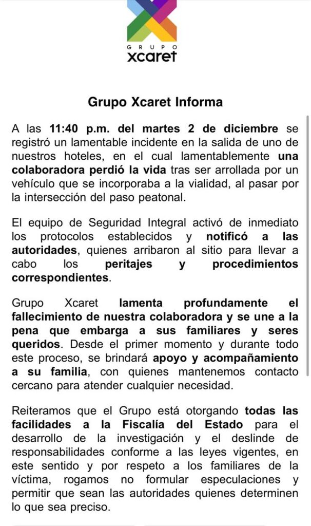 La empresa informó que el incidente ocurrió a las 11:40 de la noche del martes 2 de diciembre, cuando un vehículo que se incorporaba a la vialidad arrolló a la colaboradora al cruzar por la intersección del paso peatonal en la zona de salida del complejo hotelero.