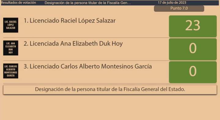 En la terna para elegir al nuevo fiscal de Quintana Roo estaban Raciel López Salazar, Ana Elizabeth Duc Hoy y Carlos Alberto Montesinos García, éstos dos últimos sin ningún voto a favor.