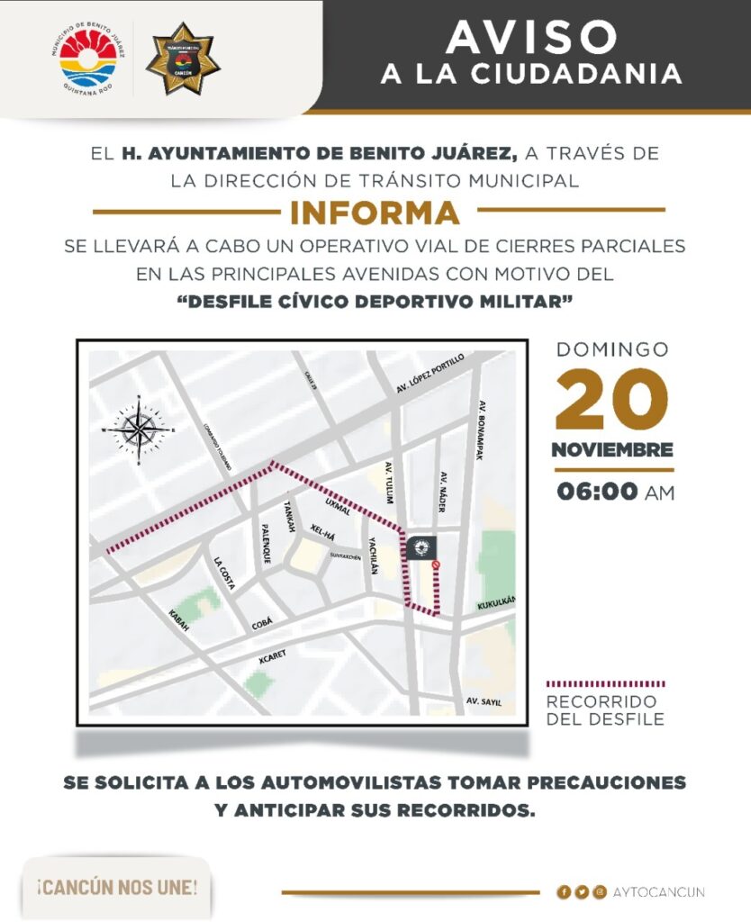 Cancún(Marcrix Noticias).- El Ayuntamiento de Benito Juárez, a través de la Secretaría Municipal de Seguridad Pública y Tránsito, pondrá en marcha el Plan Operativo con motivo del “Desfile Cívico-Deportivo-Militar”, conmemorativo al CXII Aniversario de la Revolución Mexicana que se llevará a cabo este domingo 20 de noviembre.