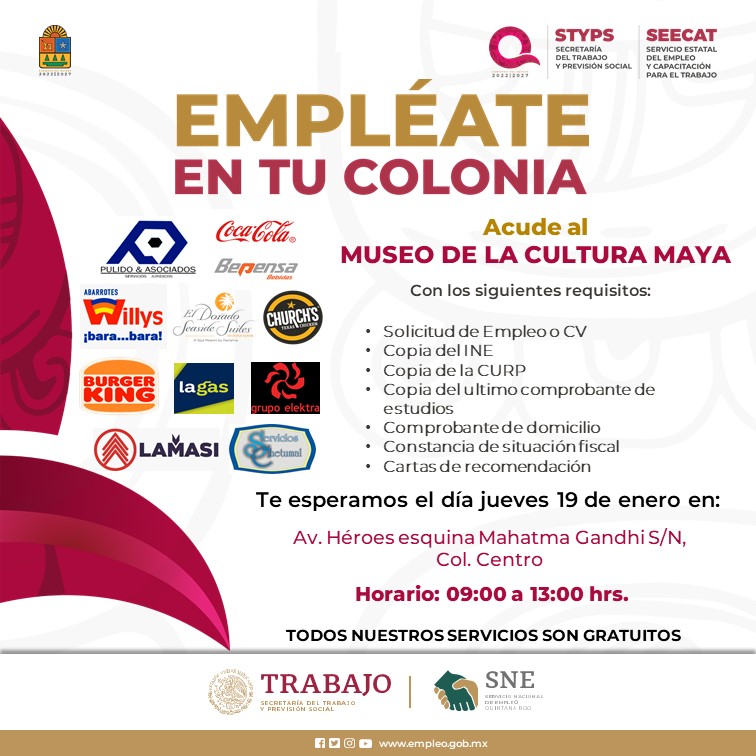 Empléate en tu Colonia se llevará a cabo el jueves 19 de enero en las instalaciones del Museo de la Cultura Maya en la colonia centro de la capital del Estado a partir de las 9 de la mañana a 1 de la tarde.
