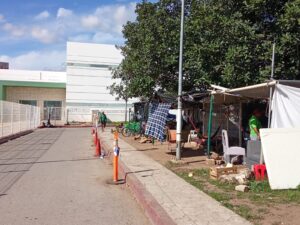 En la entrada principal del área de urgencias se han instalado estructuras improvisadas hechas con lonas y láminas negras, donde hombres, mujeres y hasta menores de edad pasan la noche expuestos a la lluvia, el sol intenso y el calor. Muchos de ellos provienen de otros municipios y comunidades del estado, lo que les impide regresar a sus hogares mientras sus familiares permanecen hospitalizados.