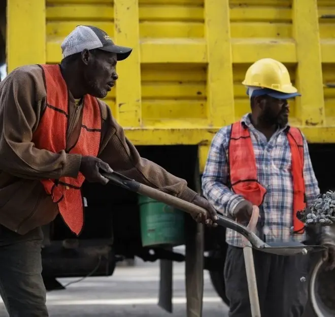 En una calle de la capital, cinco haitianos taladran el pavimento para instalar tuberías cerca de un cine abandonado. Jony, el único que habla español, es el enlace entre los patrones y el resto de trabajadores, quienes hablan criollo haitiano y sonríen a cualquiera que los mire.