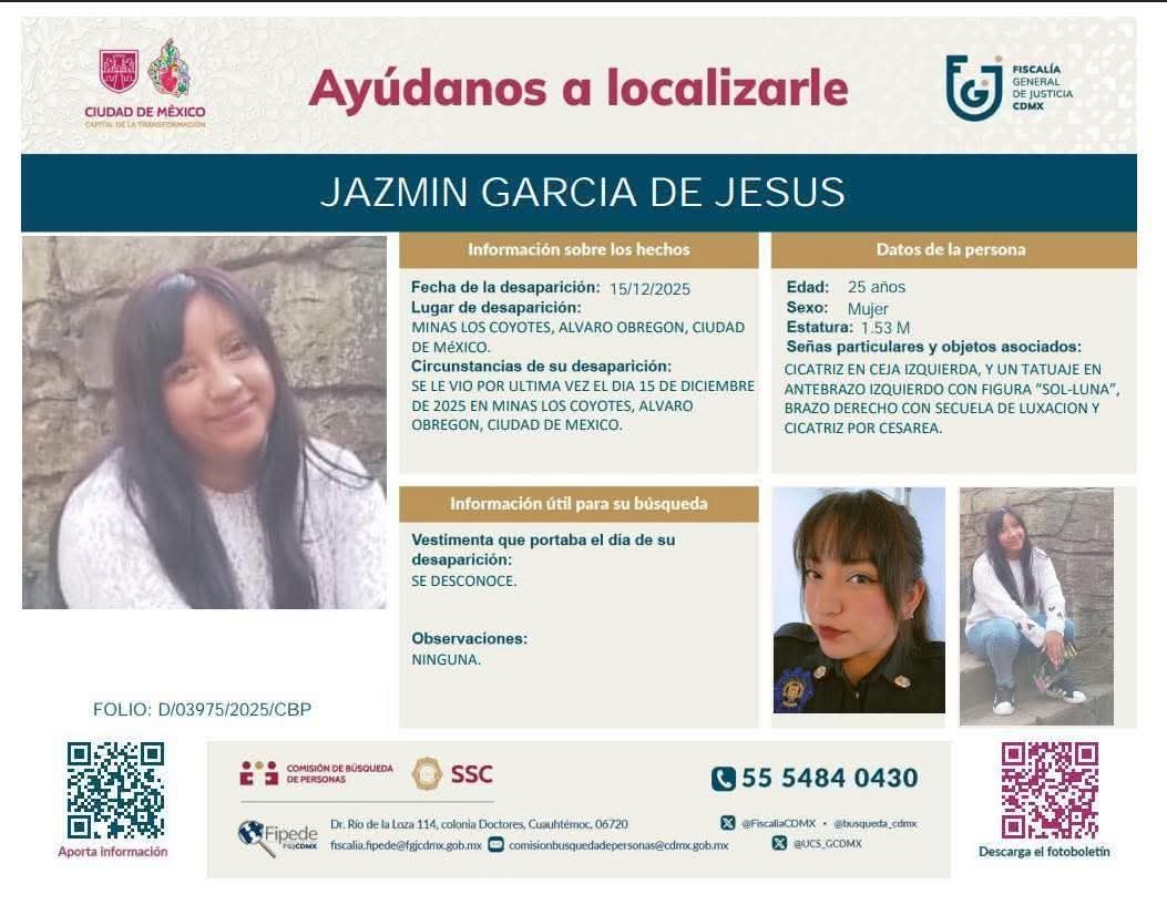 Ciudad de México. ( Marcrix Noticias).- El caso de Jazmín García, policía adscrita a la Secretaría de Seguridad Ciudadana de la Ciudad de México, conmocionó a la capital luego de que su cuerpo fuera localizado enterrado en el patio de la vivienda que compartía con su esposo, en la alcaldía Álvaro Obregón. La joven había sido reportada como desaparecida desde mediados de diciembre, lo que activó los protocolos de búsqueda.