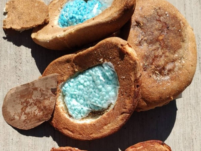 El personal de la Guardia Nacional procedió a la revisión del contenido del paquete, detectando la pieza de pan, en cuyo interior se encontró una bolsa con cápsulas de color azul, que contienen el aparente fentanilo.