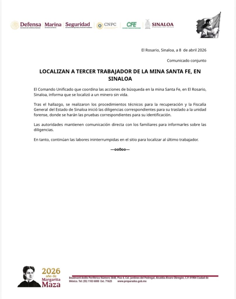 Sinaloa. ( Marcrix Noticias).- El hallazgo sin vida del tercer minero atrapado en El Rosario, Sinaloa, fue confirmado por la presidenta Claudia Sheinbaum, tras el derrumbe ocurrido en una mina de la zona a finales de marzo.