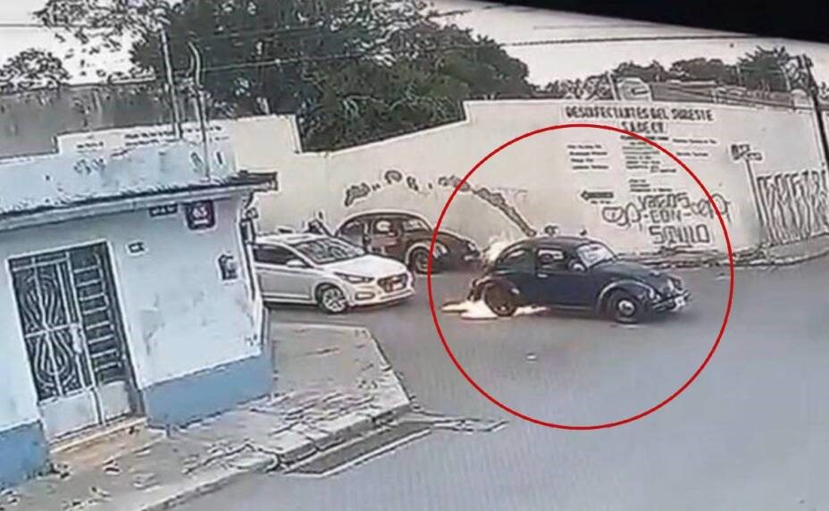 En el video se observa que al llegar a la esquina el automóvil un Volkswagen Sedán tiene una falla mecánica en el motor y la mujer que conduce le da marcha y luego se escucha una explosión en el motor y el volcho color gris oscuro empieza a incendiarse.