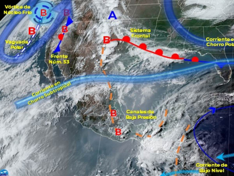 De acuerdo con el comunicado del organismo dependiente de la Comisión Nacional del Agua (Conagua), el frente frío 53 continuará como estacionario sobre el noroeste del país y seguirá interactuando con la una vaguada polar y la corriente en chorro polar; a su vez, una línea seca y un canal de baja presión se extenderán sobre el norte y noreste de México, provocando rachas fuertes de viento, lluvias y chubascos.
