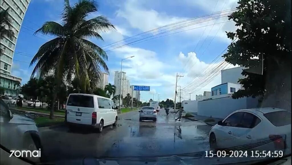En el clip, de 17 segundos de duración, también puede verse que los demás vehículos que circulaban por la avenida Bonampak aceleraron su marcha para evitar el posible robo.