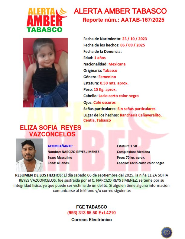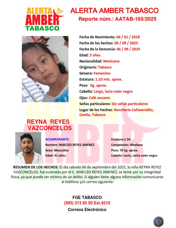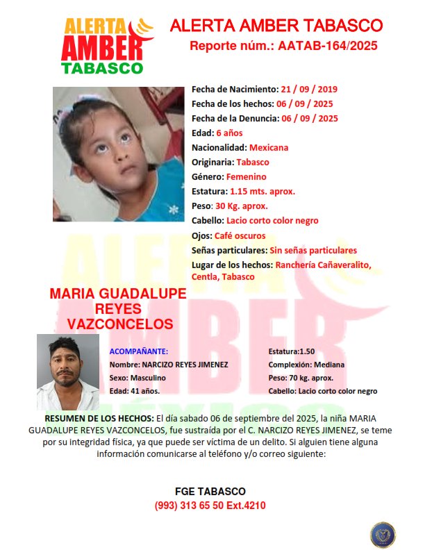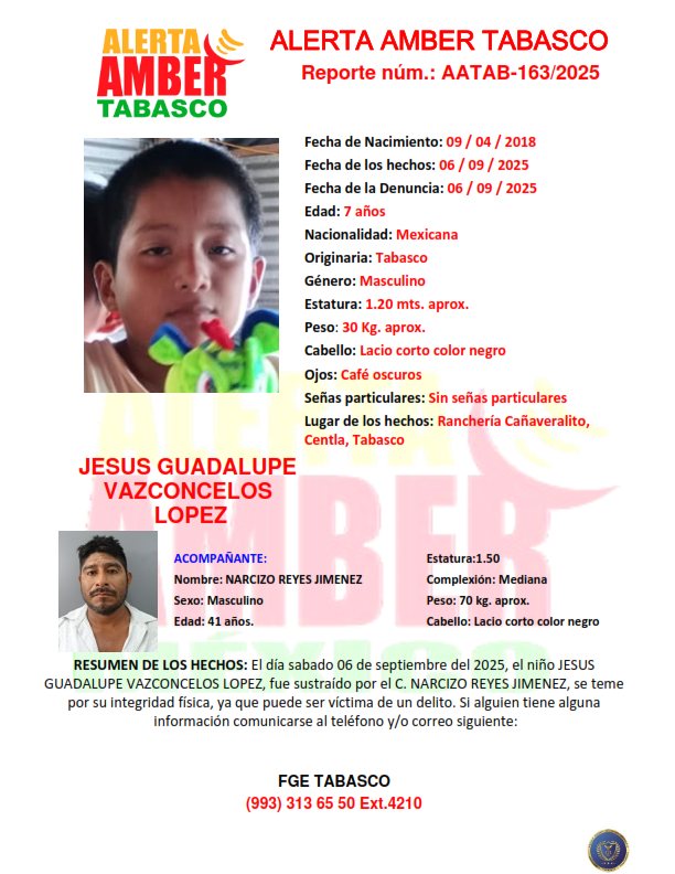 La Fiscalía General del Estado de Tabasco difundió las fichas de búsqueda de los menores y del presunto homicida, descrito como un hombre de 41 años, de complexión robusta, aproximadamente 1.50 metros de estatura, de cabello negro, corto y lacio.