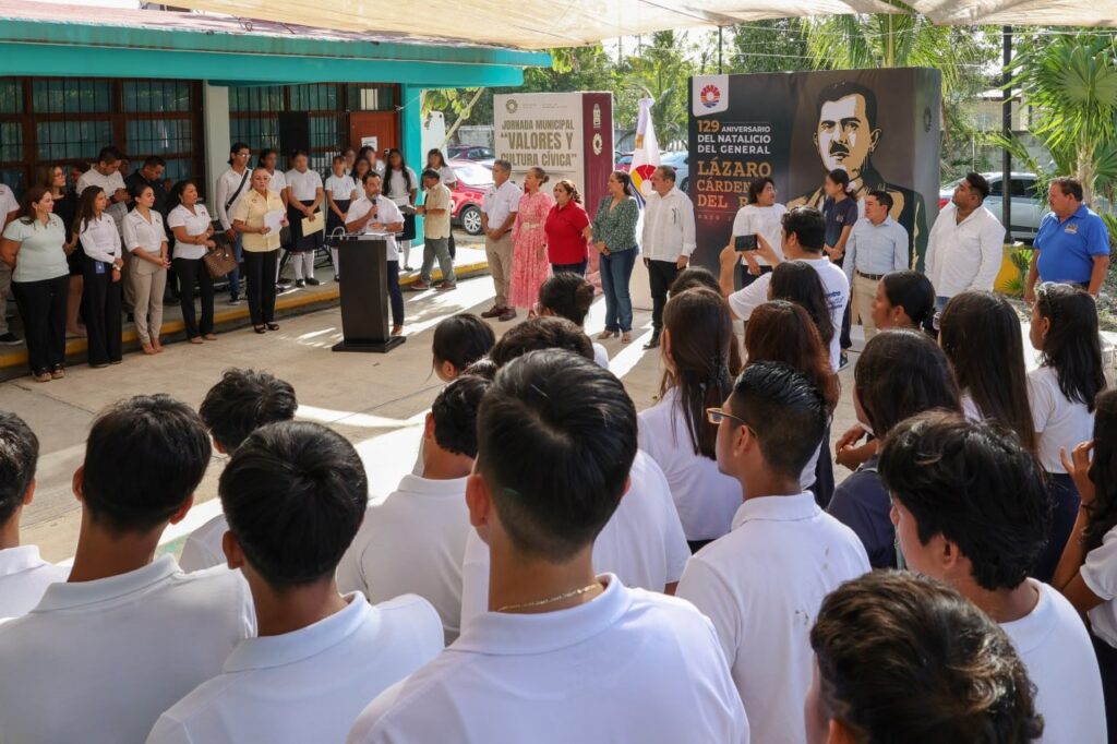 • En el marco del 129 aniversario del natalicio del general Lázaro Cárdenas del Río, las autoridades del municipio de Benito Juárez, participaron en el homenaje cívico y en las jornadas de pláticas educativas en el Colegio de Bachilleres Plantel Cancún 3, delegación Alfredo V. Bonfil.