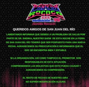 Debido a esto, Panteón Rococó anunció la suspensión del concierto programado para esta noche, dejando claro que la decisión se tomó por causas médicas y no por responsabilidad del promotor ni de la organización del evento.