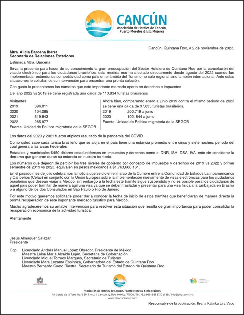 Cancún (Marcrix Noticias).- A nombre de los hoteleros de Quintana Roo, la Asociación de Hoteles de Cancún, Puerto Morelos e Isla Mujeres, enviaron este jueves una misiva a Alicia Bárcenas Ibarra, titular de la Secretaría de Relaciones Exteriores (SRE) para exigirle dar una fecha para la reinstalación del visado electrónico para brasileños.