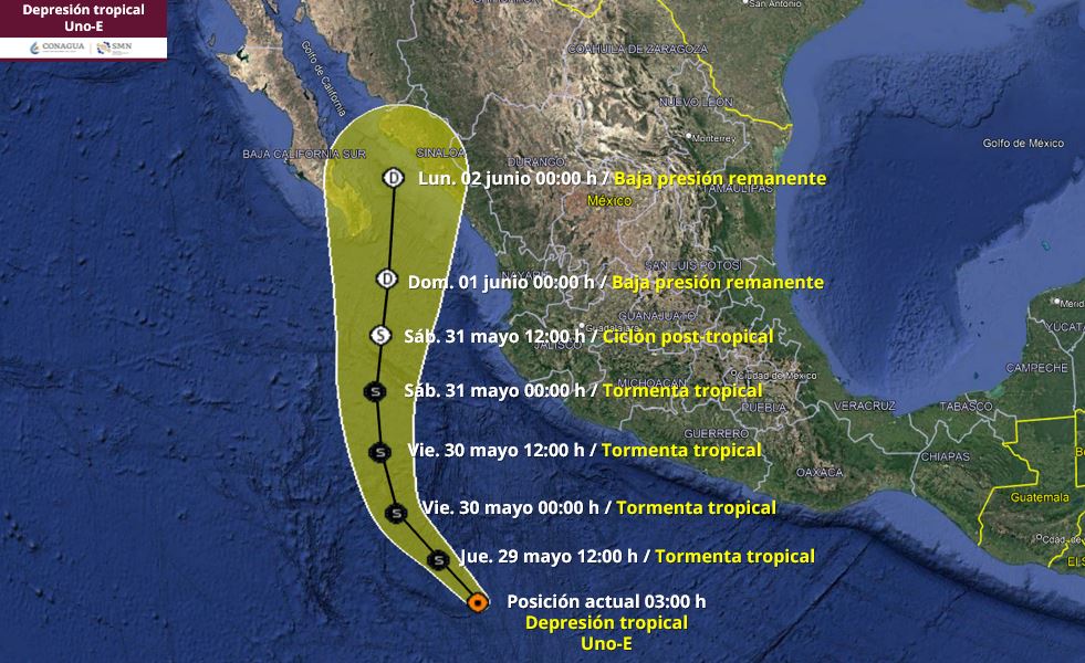 Ciudad de México (Marcrix Noticias).- Hoy jueves, se prevé que el ciclón tropical Uno-E se intensifique mientras se desplaza paralelo a las costas de Michoacán, Colima y Jalisco, sus desprendimientos nubosos originarán lluvias con chubascos en el noroeste, occidente y sur del país, con lluvias puntuales muy fuertes en Guerrero y puntuales fuertes en Jalisco, Colima y Michoacán.
