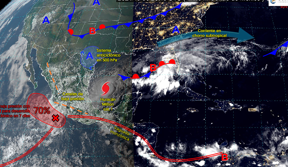 Cancún (Marcrix Noticias).- Durante esta noche y madrugada del lunes, el huracán Milton de categoría 1 en la escala Saffir-Simpson continuará intensificándose sobre la región central del Golfo de México.