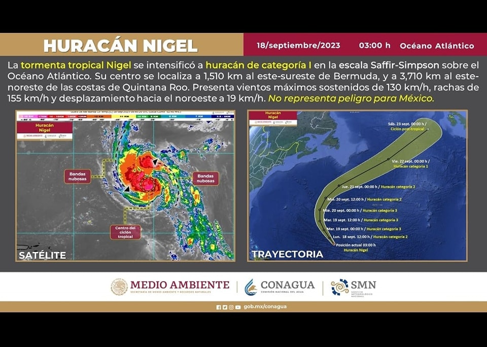 Cancún (Marcrix Noticias).— La Coordinación Estatal de Protección Civil de Quintana Roo informó este lunes que la Tormenta Tropical Nigel se intensificó a Huracán categoría 1 en la escala Saffir-Simpson sobre el Océano Atlántico, pero no representa peligro para las costas.
