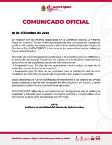 Finalmente, el Imoveqroo subrayó que continuará aplicando sanciones ejemplares para garantizar un servicio seguro, ordenado y acorde con la importancia turística de Quintana Roo.