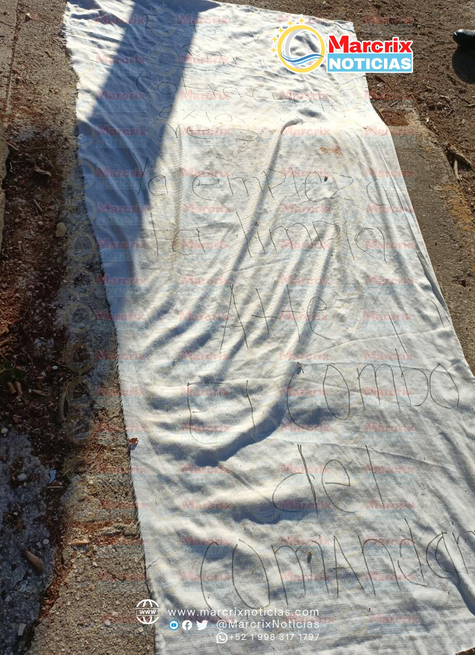 Cancún (Marcrix Noticias).- Los narcomensajes siguen apareciendo en la ciudad, en mantas o cartulinas que dejan los grupos delictivos y en las últimas 24 horas otras dos fueron colocadas en diferentes puntos de la ciudad.